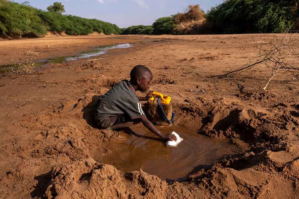 深刻な干ばつで干上がった川から、わずかに残った水を集める男の子(ソマリア)
