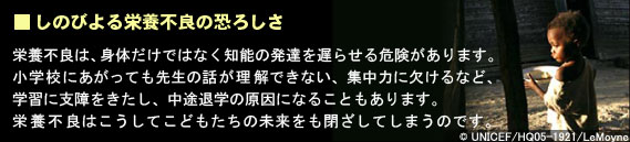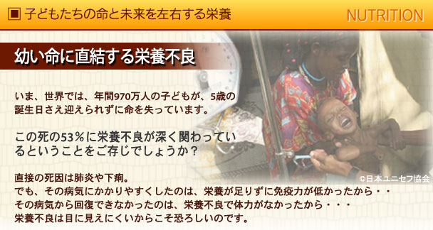 二人に共通しているのは限られた食材しか口にしていないということです。栄養が偏って成長に欠かせないたんぱく質が不足しているのです。ビタミンAなど、免疫力をつける栄養素も足りないので病気にかかりやすく、基礎体力がないので風邪や下痢などのありふれた病気が原因で命を落とす危険があるのです。 |