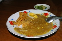 ミャンマーカレーは野菜や肉など、どんな材料でも似たような感じに調理してしまうのですが、とにかく油が多くて表面に油の層が2センチぐらい浮いているくらいです。レストランなどで食べる時にはミャンマーカレーを一品一品小さなお皿に盛って、ご飯と何品かのカレーをみんなで一緒に食べる感じです。家庭だとこれが1〜2品になります。基本は似ているようですが、田舎に行くと味付けが単調になったり、とくに唐辛子が多くなってものすごく辛くなったりします。(ご飯をたくさん食べられるようになんでしょうか)。田舎の方で貧しくなってくると、カレーはなしでご飯にガピッと呼ばれるえびの塩辛をつけて食べたり、ご飯と干し魚一切れなんて感じでしょうか。でも昼を抜いたりはしないそうです。