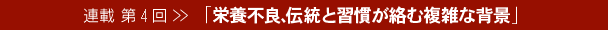 <錦織信幸> ドンピシャです。妊産婦さんに対する禁止食品(フードタブー)が大きな原因のひとつとしてあげられています。妊娠中にこれをしちゃいけない、これを食べてはいけないという慣習は日本も含めてどこにでもあるものなのですが、これが文化、伝統、慣習、家族システムの中に強固に根付いているので非常に厄介です。