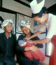 テット・モンちゃんはようやく1歳になりました。保健員さんにほっぺをつままれ、泣き出してしまいました。何をされるの?という表情でぶるぶると震えています。 その瞬間、保健員さんが、テット・モンちゃんの口の中にビタミンAをポトリ。テット・モンちゃんは泣き止みました。顔中笑顔でくちゃくちゃにして、手を鳴らしているではないですか。 お母さんも笑顔でいっぱいです。子どもの笑顔が嬉しくて、そして、子どもが健康に育つことを確認して、お母さんの顔もくちゃくちゃです。