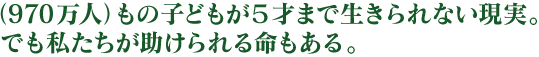 そのうち300万人は、5才どころか生後1ヶ月で夢を持つこともなく命を落としているんです。そのほとんどが下痢、肺炎、栄養不良などが原因です。安全な飲み水やワクチンがあれば予防できるのに。人身売買とか、性的な虐待も深刻です。ユニセフでも毎年地震、津波、紛争などで被災した人々に対する緊急支援に加えて、子どもたちの命を守る基本支援、つまり衛生環境、食料、予防接種、医療、教育なども150カ国以上でやっていますが、本当に大変なんです。少しずつ死亡率は減ってはいるけれど、皆さんの協力があればもっと助けられると思うんです。