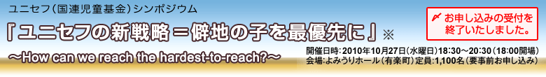 当初「テロに晒される人道支援」というタイトルでご案内をしておりましたが、シンポジウムプログラムについてユニセフ本部等と協議する過程で、より同内容を表現するものとしてふさわしいタイトルにすべきとの判断から、「ユニセフの新戦略=僻地の子を最優先に」に変更させていただきました。ご了承ください。