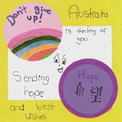 あきらめないでね!というメッセージと「希望」と漢字で書かれたカード。
