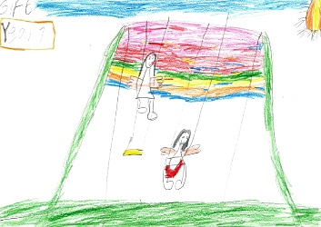 女の子たちがブランコで楽しそうに遊んでいる絵 Drawing of girls playing on the swing.