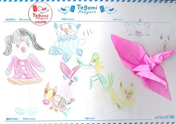 アニメのキャラクターや動物、女の子の絵と折鶴がついているお手紙。 A letter with drawings of animation characters, animals, a girl, and an origami crane.