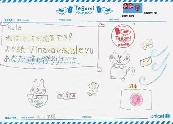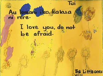「お手紙ありがとう」と現地の言葉を使って書かれたお返事。 Letter of appreciation with a message in Fijian language.