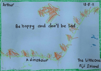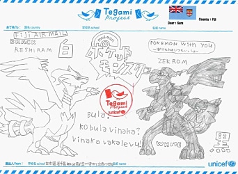 現地語のメッセージと、 大好きなアニメのキャラクターが大きく描かれたお返事。 Big drawing of his favorite animation character and message of appreciation in Fijian language