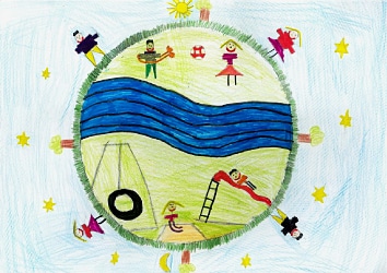 丸い地球で子どもたちが楽しそうに遊んでいる絵Drawing of children playing on the earth with a joy