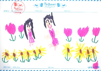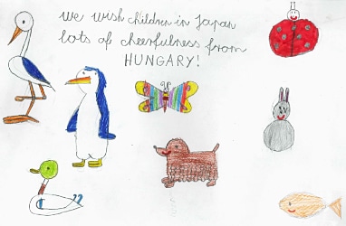 「日本の子どもたちが楽しい気持ちになりますように!」とたくさんの動物が描かれた絵A drawing of lots of pretty little thingswith a word of "We wish children in Japan lots of cheerfulness"