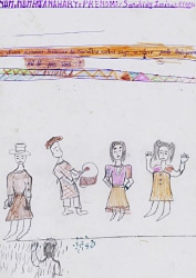 学校で受け継がれている坂水庭田植踊りと大好きな野球、 お寿司が描かれた絵。 Drawing of their traditional dance, Sakamizuniwa-Taue-Odori, and his favorite Sushi and baseball