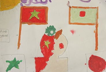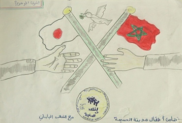 国と国とが手を取り合い、つながっていることを描いた絵 Morocco and Japan take each other’s hands. The drawing shows that the two countries are connected.