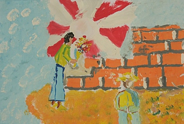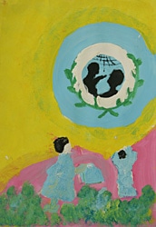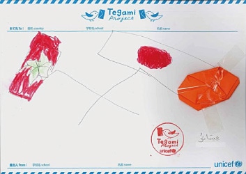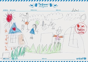 明るい空の下に子どもたちとユニセフのロゴマークを描いた絵 Drawings of children under a bright sky with UNICEF’s logo mark.