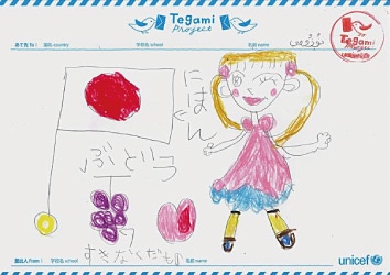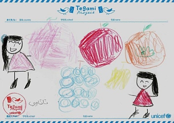 大好きなフルーツの絵と自分の名前をアラビア語で書いたお返事。 Drawing of her favorite fruits and her name written in Arabic