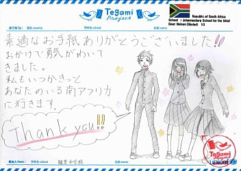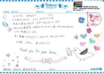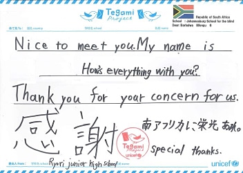 お手紙をもらって勇気が沸いてきました。 いつかみんなのいる南アフリカに行きます。 Your letter really encouraged me. I will visit your country someday to see all of you.