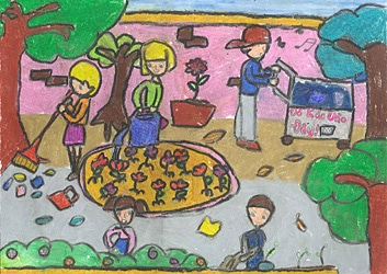 花を育てる子どもたちの絵 A drawing of children glow flowers.