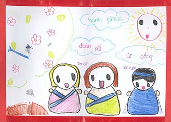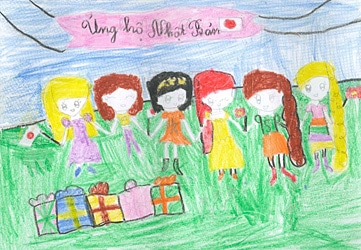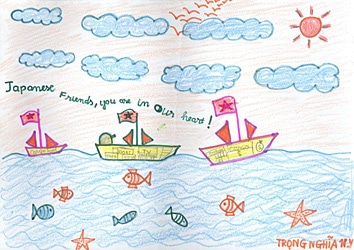 ベトナムから日本へ救援物資を運んでいる絵 Drawing of ships delivering emergency relief supplies from Viet Nam to Japan.