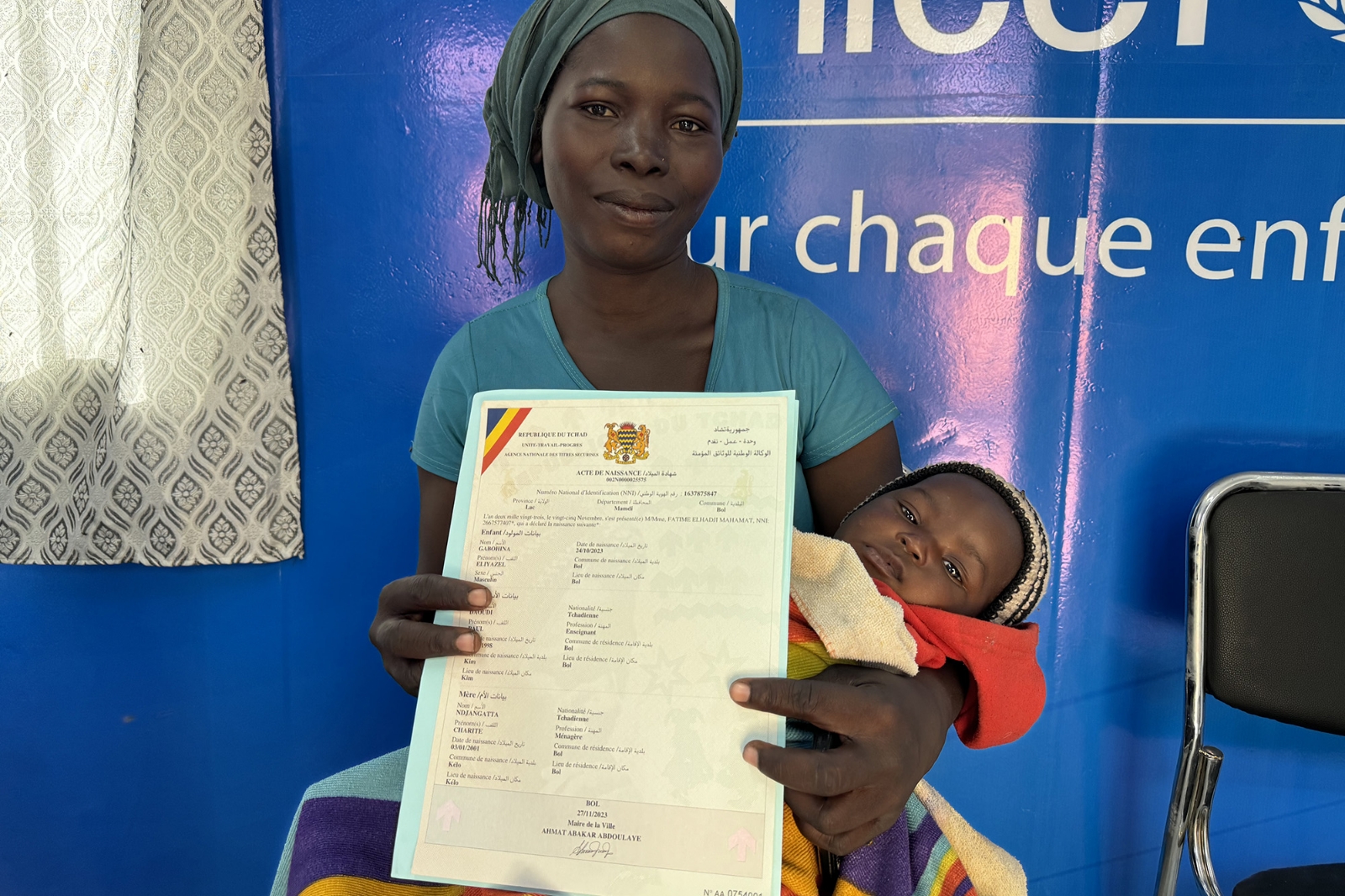 チャド西部に位置するラク州ボルの州立病院─今日はンジャンガッタさんと息子のガボヒナくんにとって、特別な1日になりました。生まれて3カ月が経つガボヒナくんの出生証明書を、ようやく受けとることができたのです。「出生登録の大切さを知って、この子のために届出をしようと思いました」とンジャンガッタさん(23歳)はほほ笑みます。