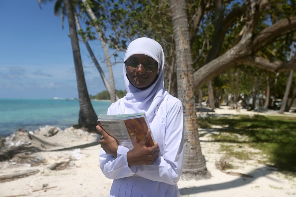 インド洋に浮かぶ約1200の島々からなり、青い海と白い砂浜、美しいサンゴ礁で知られるモルディブ共和国。そのうちのひとつ、ディフシ島に住むファティマスさんは、「高潮が起きると、靴と靴下を脱いでスクールバッグに入れるんです。教室にたどり着くまで、水の中を歩かなくてはならないから」と話します。
