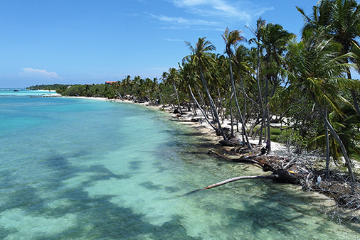 2015年以降、海面上昇ですでに約60メートルにわたって砂浜が失われているディフシ島。アイシャス校長は、「私の子ども時代、砂浜は木々でいっぱいでした」と懐かしみます。「濃い緑の茂みがあって、見通しがきかないほどでした。でも今は、かつてあった砂浜の大部分が失われてしまいました」