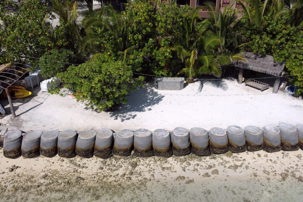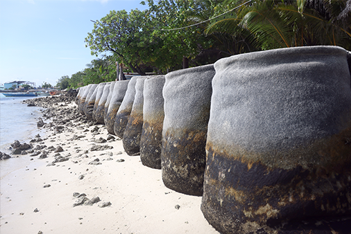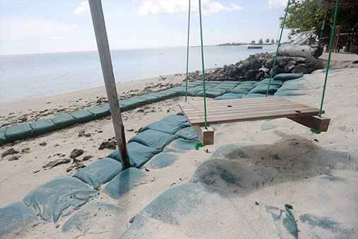 海岸には、一列に並べられた土嚢や、コンクリートの護岸や防波堤が目立ちます。「2050年に人が住めるような土地がなくなり、今世紀末には完全に消滅する」と予測する声もあるこの国では、気温の上昇により、デング熱のような感染症も増加しています。