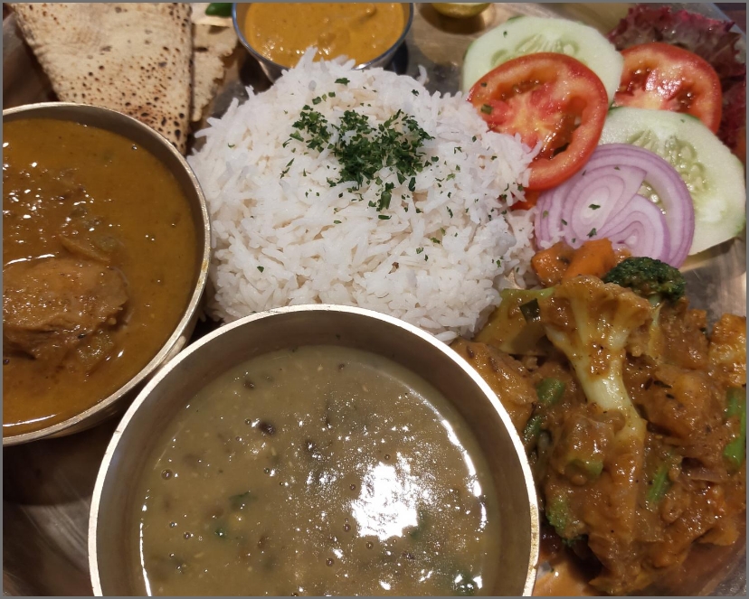 ネパールの代表的な料理といえば、この定食のような「ダルバート」。事務所の近くの食堂で、チキンカレー付きのダルバートを注文しました。おかわりができるお店がほとんどなのでお腹いっぱい食べられます。