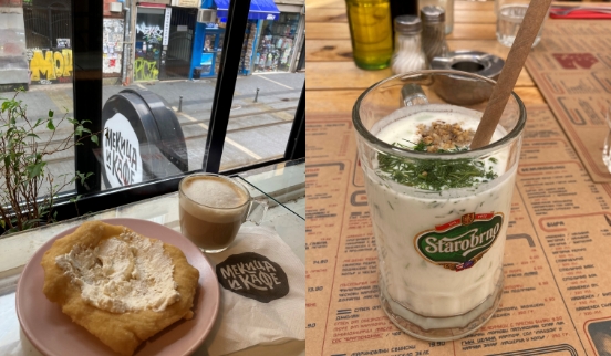 (左)ブルガリアの伝統的な朝食であるヨーグルト入りドーナツ「メキスタ」